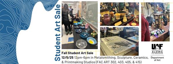 The biannual student art sale is back! Support student artists and find unique holiday gifts at the Fine Arts Complex held in rooms 302, 403, 405 and 415. The sale features ceramics, prints, sculptures, metalwork and more created by students. Proceeds benefit student artists and their organizations, including the Student Ceramic Arts Guild, Student Art Alliance of the North, Students Learning Art Guild and the Alaska Metal Arts Guild.